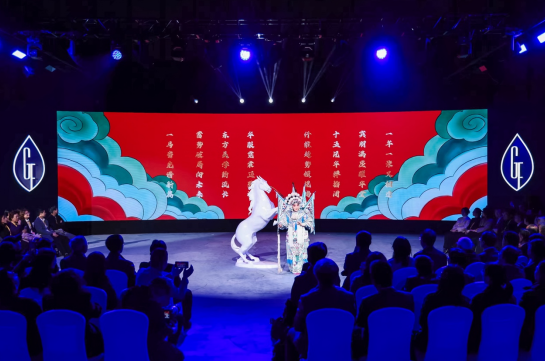 大秀啟幕,京腔雅韻先聲奪人。京劇新生代演員,一襲綾羅青衫頭戴鳳冠,恍若仙子凌波、自云端降世。行至臺前,八句京腔念白字字珠璣,一念一韻,一白一境,古韻與時尚在這一刻隔空和鳴。馬鞭輕揚,東方美學大幕正式拉開;光影流轉間,五十套高定華服次第登場,鋪展成一幅流動的東方美學畫卷。