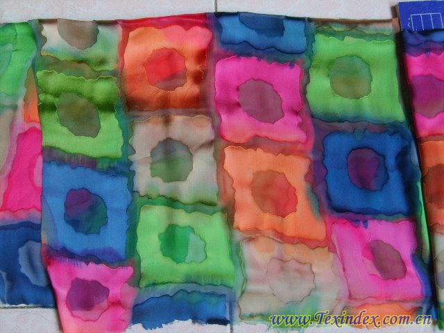 產(chǎn)品:真絲爛花綃;花型呈幾何形狀,印花采用手繪工藝,色彩絢麗。