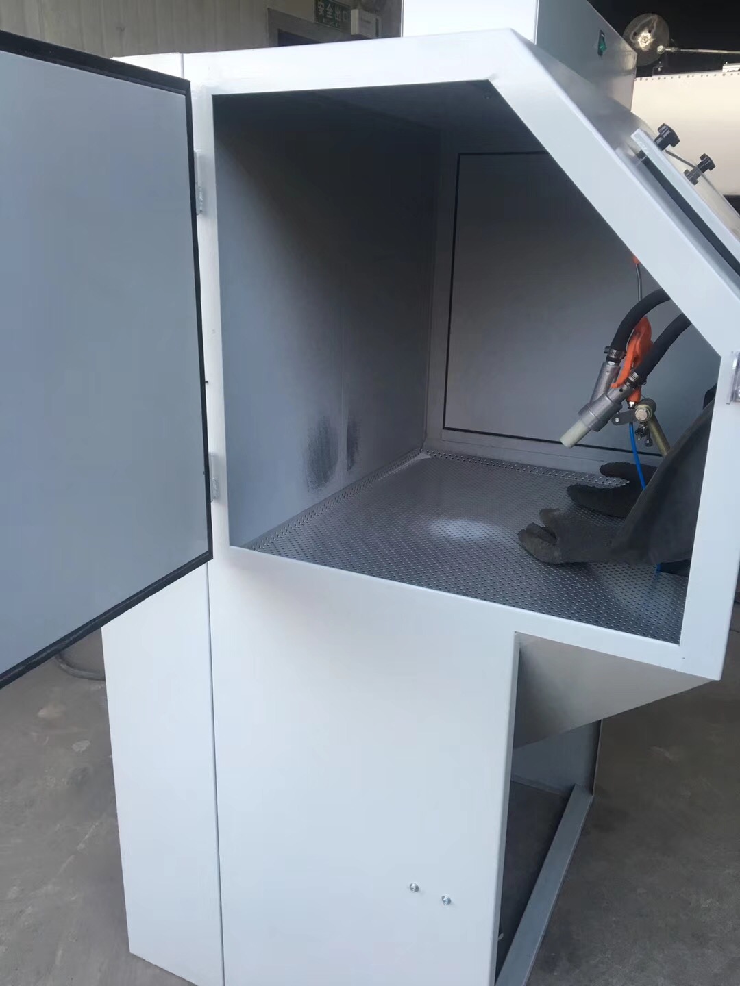 箱式噴砂機是將噴砂系統與箱體防護組合到一起,將噴砂空間控制在一個范圍里,實現沒有粉塵外泄的噴砂狀態。