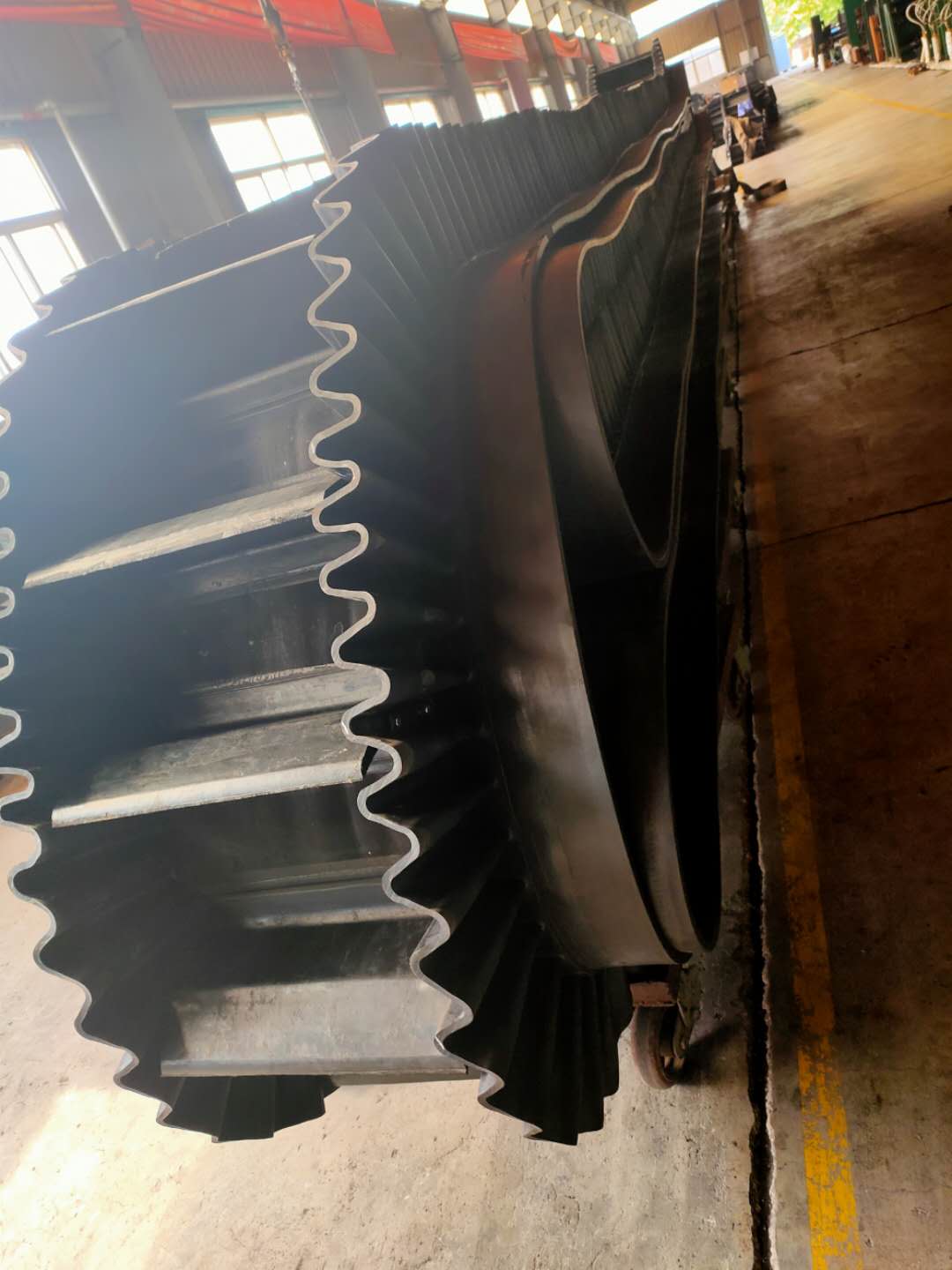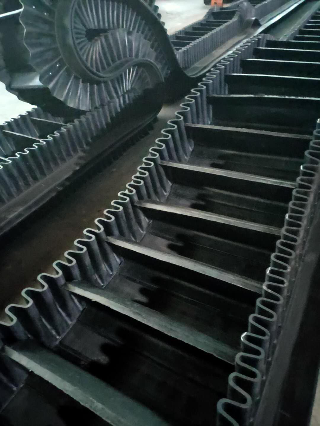 大傾角擋邊帶由基帶、波紋擋邊、橫隔板3部分組成。擋邊起防止物料測滑撒落的作用。為便于繞過滾筒,檔邊設計成波紋狀;橫隔板的作用是承托物料,為了實現大傾角輸送,采用T型TC型設計。檔邊和橫隔板是用二次硫化的方法與基帶連接的,具有很高的連接強度。