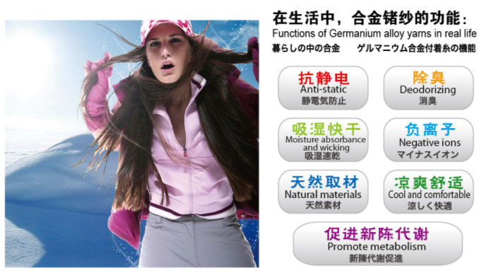 合金鍺一直是日本風(fēng)行的保健產(chǎn)品,具有負(fù)離子、遠(yuǎn)紅外線、促進(jìn)血液循環(huán)等功效,已經(jīng)于市場(chǎng)上被大量運(yùn)用制成手環(huán)、項(xiàng)圈等兼具保健與美觀的商品,而本公司的合金鍺也具有上述功能。本公司經(jīng)高溫表面改質(zhì)的合金鍺,具有強(qiáng)力的吸附效果,可吸附臭味、水氣,讓合金鍺紗發(fā)揮更舒適的效果。