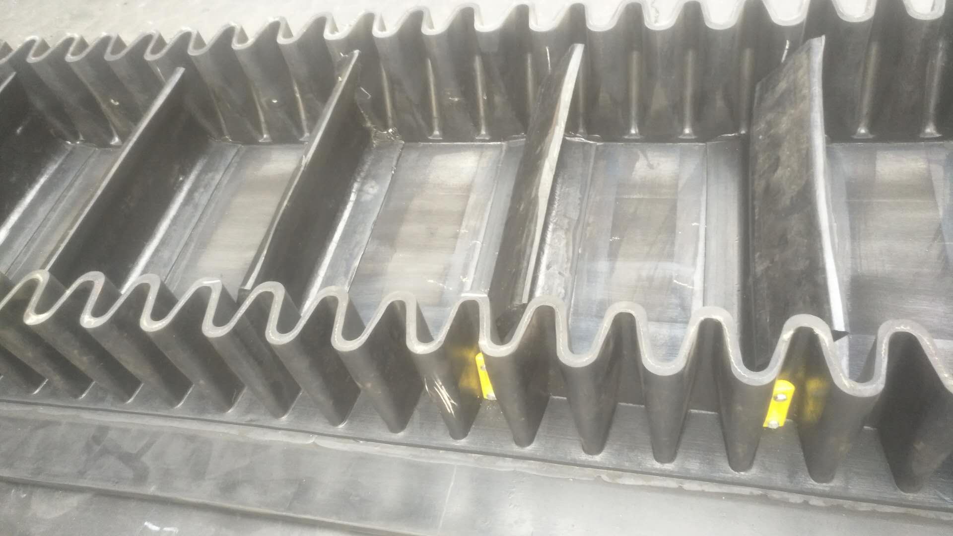 大傾角波狀擋邊帶由基帶、波紋擋邊、橫隔板3部分組成。擋邊起防止物料測滑撒落的作用。為便于繞過滾筒,檔邊設(shè)計(jì)成波紋狀;橫隔板的作用是承托物料,為了實(shí)現(xiàn)大傾角輸送,采用T型TC型設(shè)計(jì)。檔邊和橫隔板是用二次硫化的方法與基帶連接的,具有很高的連接強(qiáng)度。