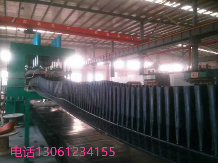 橡膠擋邊帶由基帶、波紋擋邊、橫隔板3部分組成。擋邊起防止物料測滑撒落的作用。為便于繞過滾筒,檔邊設計成波紋狀;橫隔板的作用是承托物料,為了實現大傾角輸送,采用T型TC型設計。檔邊和橫隔板是用二次硫化的方法與基帶連接的,具有很高的連接強度。