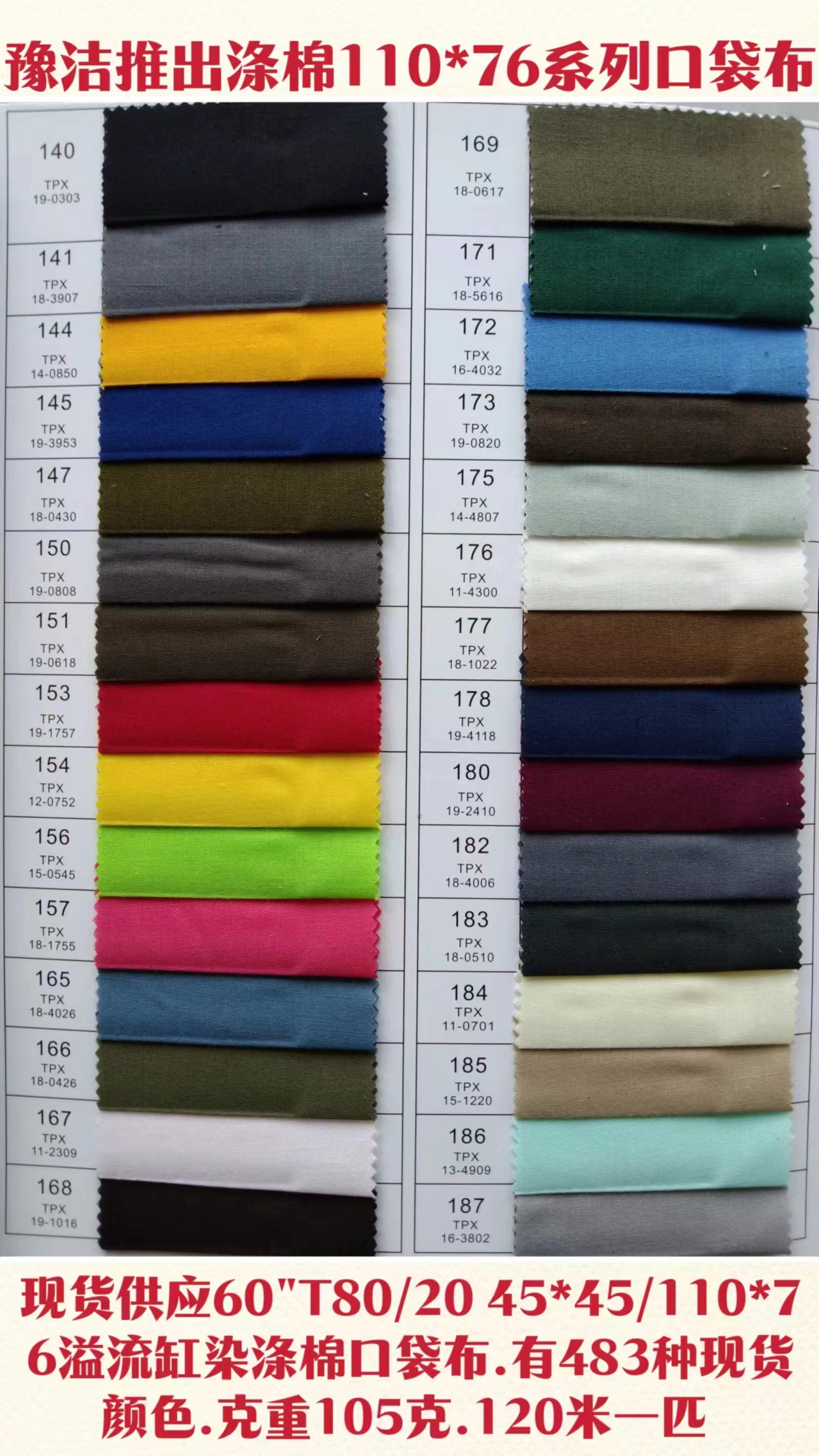 倉庫常年現貨供應60"T80/C20 45X45/110X76有483種顏色口袋布,