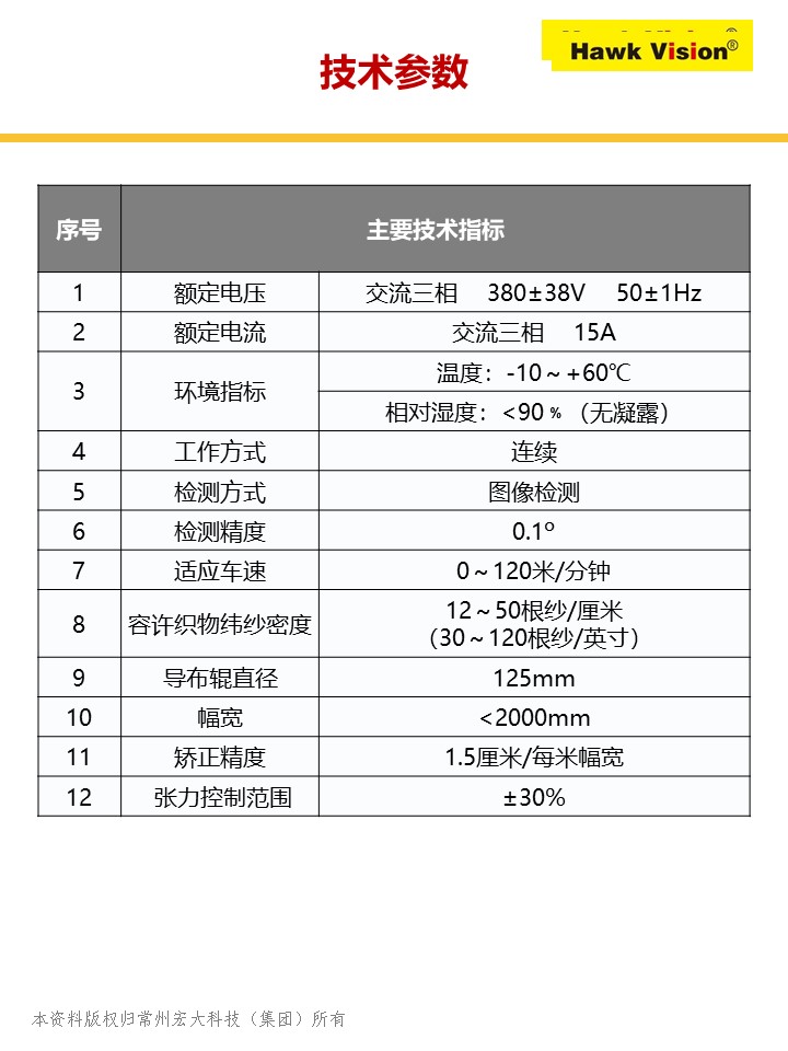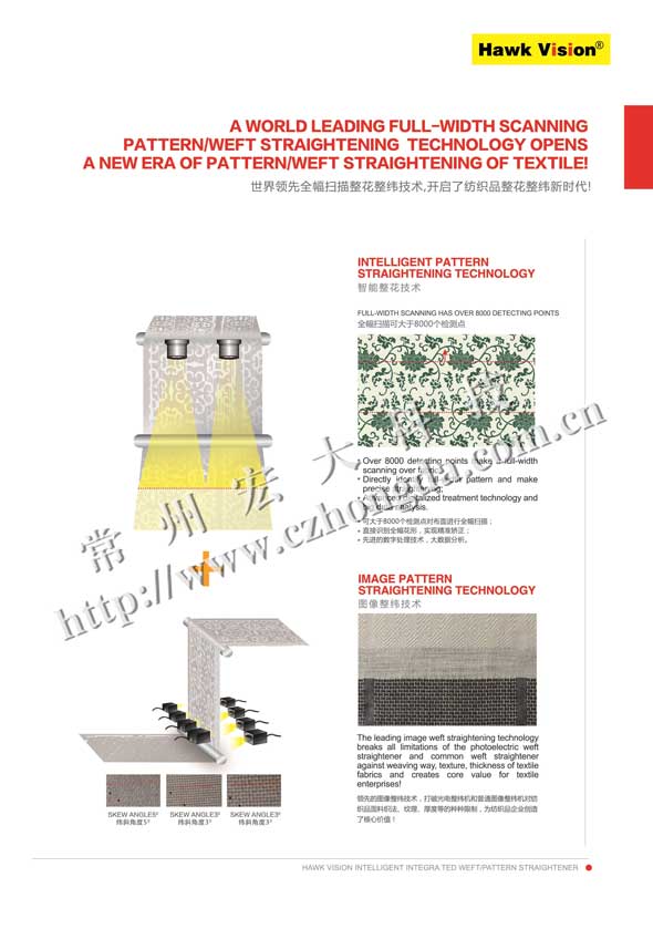 Hawk Vision 智能圖像整花整緯機一體機,是“霍克威視”品牌依托其強大的歐洲技術(shù)背景和常州宏大深厚的技術(shù)研發(fā)實力,首創(chuàng)國際領(lǐng)先的“全幅掃描整花整緯技術(shù)”,全幅掃描可大于8000個監(jiān)測點,徹底解決了光電整緯無法矯正和識別的紡織品花型變形、緯斜、緯彎問題,超越了光電整緯和普通圖像整緯的價值!系統(tǒng)具有廣泛的品種適應(yīng)性,除了適用于光電整緯的全部品種,還適應(yīng)光電整緯無法正常識別和矯正的品種,如色織布、提花布、厚重織物、斜紋布、磨毛布、針織布、牛仔布、印花布等,大大提高了紡織品后整理質(zhì)量水平,實現(xiàn)了紡織品智能整花、整緯的革命性突破,開啟了紡織品整花、整緯的新時代!該裝備已在國內(nèi)多家優(yōu)秀企業(yè)成功使用,收效顯著,提升了企業(yè)的市場競爭力,為客戶創(chuàng)造了核心價值。